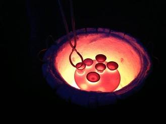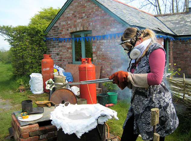 Pots are quick fired in a kiln to around 1000°c for around half an hour or under, they are then taken out of the kiln with tongs and placed in sawdust and other combustible materials where they are allowed to burn.